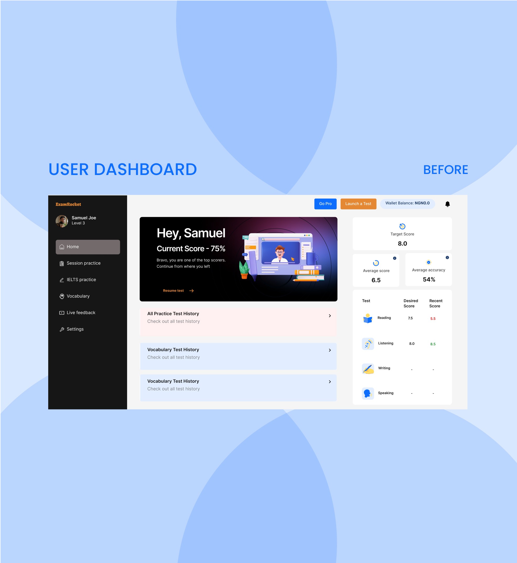The platform was redesigned to become the top choice for IELTS practice. The focus was to improve the key features, fix usability problems and create a more engaging look and feel that keeps users coming back.